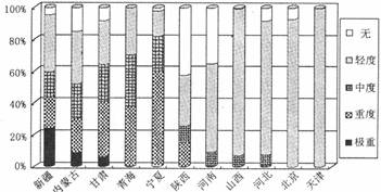 35.[环境保护]下图为“1951-2000年我国部分省级行政区受沙尘暴影响强度比例统计图”。读图回答下列问题。(10分)