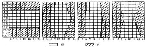 11.下面是以北极为中心的图形,斜线部分是3月21日,表示武汉3月22日5时的应是( )