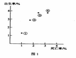 甲市2008年户籍人口出生9.67万人,出生率为0.699%;死亡10.7万人,死亡率为0.773%.甲户籍人口这种自然增长态势已持续14年.图1显示四个地区的人口出生率和死亡率,据此完成1-2题
