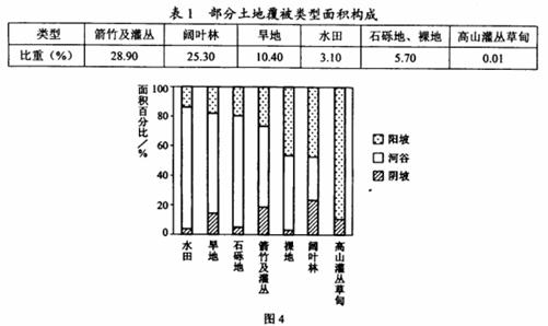 我国南水北调方案中涉及的某水源地总面积约94700K㎡,表1为该区域部分土地覆被类型面积构成,图4示意该区域部分土地覆被类型的地形构成。据此完成9-11题。