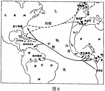 材料一 随着新航路的开辟,世界历史加快了从分散走向整体的进程。洲际贸易是近代世界不同地区之间经济与文化联系的主要内容之一。三角贸易兴起于16世纪,在17-18世纪成为最重要的洲际贸易,因涉及欧洲、非洲和美洲三地,且其主要商路连接成三角形,故称“三角贸易”。满载着枪支、纺织品、铁器和奢侈品等货物的商船,从利物浦等欧洲港口“出程”;到达非洲后,用上述商品交换被掠来的非洲黑人,然后经大西洋西航美洲,此为“中程”;商船到达美洲后,以这些黑人换取蔗糖、咖啡、烟草、棉花等物品,再运回欧洲,此乃“归程”。一次三角贸易的航程,大约需时半年,可做三笔生意,获得数倍的利润。利物浦等城市因此兴盛起来。