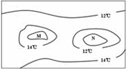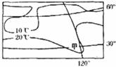 下图为某大陆与相邻海洋的等温线分布图,读图回答14-15题。