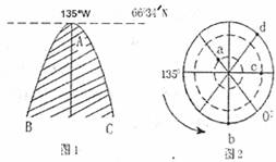 41、读下图,图l和图2处于完全处于同一时刻,阴影部分表示黑夜,据图完成下列要求: