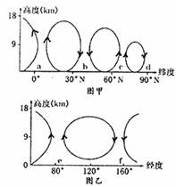 44.读北半球大气环流剖面示意图(图甲)及沿30°N的大气环流剖面示意图(图乙),若两图季节相同,完成下列要求。