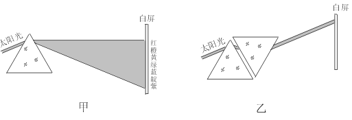 [演示6]照上图乙那样,把 另一个相同的棱镜按相反的方向放在前一个棱镜旁边(两个棱镜要靠得近些),让学生观察在白屏上又能看到什么?