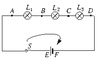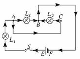 方法指导:用电流路径法识别电路时,让电流从电源的正极出发经过各用电器,回到电源负极;如果途中不分流,只有一个回路,不出现“分支点”“汇合点”,那么这个电路就是串联电路(如图5-44所示,图中灯L1、L2、L3串联,电流路径E→S→A→L1→B→L2→C→L3→D→F是一个回路);如果电流途中直接在“分支点”分成几条支路,再直接在“汇合点”汇合,回到负极,形成几条回路,那么这个电路就是并联电路(如图5-45所示,开关S闭合后,电流由正极E出发,流经开关S在分支点A处分成三支:一支路径为E→S→A→L1→B→D→F;一支路径为E→S→A→C→L2→B→D→F;一支路径为E→S→A→C→L3→D→F,三支均在D处汇合再回到负极F,形成三条回路,灯L1、L2、L3为并联);如果电流先流经电路元件L1,再从“分支点”分成几条支路,再由“汇合点”汇合回到电源负极,如图5-46所示(或者由几条支路汇合后,再经过电路元件L3,回到电源负极,如图5-47所示),那么这个电路既有并联又有串联,统称为混联.图5-46和图5-47所示电路均为混联电路,不同之处是图5-46中是灯L2与L3并联再与灯L1串联,而图5-47中是灯L1与L2并联后再与灯L3串联.