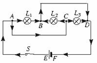 解析:此题考查同学识别电路的能力,解此题可用“电流路径法”.当开关S闭合,S1、S2断开时,电流由正极出发经S→灯L1→电表A→灯L3再回到负极,形成一个回路,故灯L1、L3串联,当S、S1、S2均闭合时,把电流表A视作“导线”,可观察到L3被短路,再把电流表A“还原”至原位,可见电流表A在灯L2支中路,它测通过灯L2的电流.