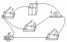 解析:第一步,“走一遍”对电路形成整体印象.电流由电池组正极出发流到灯泡L的一个接线柱时分成两支路.一支路经L至开关S1;另一支路经开关S2至电动机M,两支路均在开关S的一个接线柱上汇合,经开关S最后回到电源负极,可见,灯L与电动机M并联,开关S1控制灯L,开关S2控制电动机,开关S控制整个电路,处于干路上.第二步,根据对电路的总体印象和各实物分布.确定相应位置和布局,画出相应电路元件的符号,如图5-49所示.第三步,按电路结构把元件符号连成电路图,并标上“分支点”“汇合点”和相应的字母,如图5-50所示.