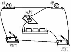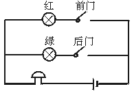 解析:本题考查串、并联电路的组成,电路连接,以及设计简单电路的能力.按前门开关,铃响红灯亮,说明前门开关控制红灯和电铃,它们可组成一个回路;同理,后门开关、电铃、绿灯也可组成一个回路.但电铃只有一个.所以电铃必须连在干路上;红、绿灯并联,且各有一个开关控制,才能达到要求.电路图如图5-52所示,实物连接如图5-53所示.