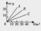4、 如图所示是A、B、C三种物质的质量m与体积V的关系图线。由图可知,A、B、C三种物质的密度ρA、ρB、ρC之间的大小关系是 ( )