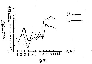 右图是以美国心理学家对小学一年级学生至成年人进行大规模有组织的的创造性思维测验后,根据其中的流畅性分数绘制的曲线图.