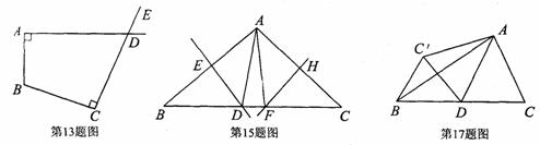 17.如上图,在△ABC中,AD为△ABC的中线,∠ADC=60°,BC=4cm,将△ACD沿AD翻折与△AC′D重合,连结BC′,则BC′的长度为________.