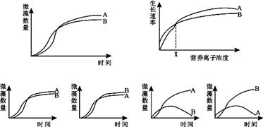 20.A、B两种微藻对磷元素需求较高,用相同的培养液分别培养A和B得到两种微藻的生长曲线如图甲所示,图乙表示A、B微藻在不同的磷元素浓度下的生长速率曲线。现将两种等体积的微藻混合培养在磷元素初始浓度为X的环境中,若只考虑磷浓度的影响,那么随时间的推移预期两种微藻的数量变化曲线可能是 ( )