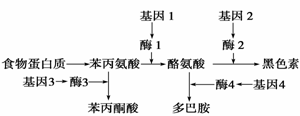 19. 人类白化病和苯丙酮尿症是由于代谢异常引起的疾病,下图表示在人体代谢中产生这两类疾病的过程。由图中不能得出的结论是