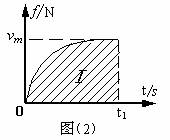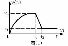 整个过程中,先是变加速运动,接着匀减速,最后匀速运动,作出v-t图线如图(1)所示。由于第一段内作非匀变速直线运动,用常规方法很难求得这1800m位移内的运动时间。考虑动量定理,将第一段的v-t图按比例转化成f-t图,如图(2)所示,则可以巧妙地求得这段时间。