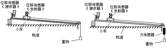 Ⅰ(8分)在用DIS研究小车加速度与外力的关系时,某实验小组先用如图(a)所示的实验装置,重物通过滑轮用细线拉小车,位移传感器(发射器)随小车一起沿倾斜轨道运动,位移传感器(接收器)固定在轨道一端。实验中把重物的重力作为拉力F,改变重物重力重复实验四次,列表记录四组数据。
