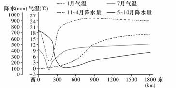 下图为某大陆沿纬线气温和降水变化曲线图,读图回答21~22题。
