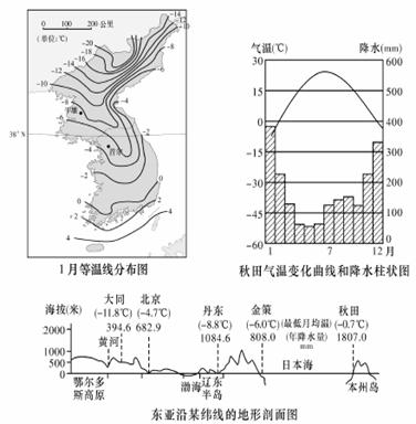(2)依据“东亚沿某纬线的地形剖面图”和“秋田气温变化曲线和降水柱状图”分析东亚冬季气温的水平差异及秋田降水季节分配特点及原因。(8分)
