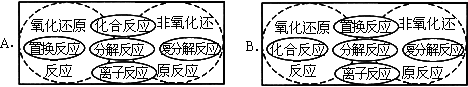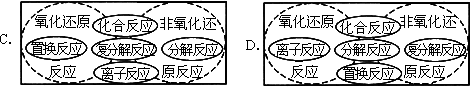 思考:下列方框代表化学反应的集合、圆圈代表某种反应类型的集合,其中,表示的关系正确的是 ( )