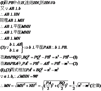 79. 如图,已知a、b是两条相互垂直的异面直线,其公垂线段AB的长为定值m,定长为n(n>m)的线段PQ的两个端点分别在a、b上移动,M、N分别是AB、PQ的中点。