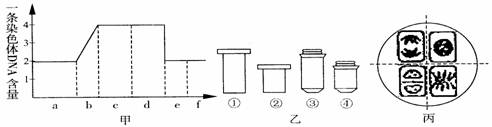 10.下面甲图为洋葱根尖生长点连续分裂的细胞在各个时期一条染色体中DNA含量随时间的变化曲线,乙图是一组标有5 ×和16 ×字样的目镜和标有10 ×和40×字样的物镜,丙图是某同学在乙图中选用的一组能放大160倍的镜头组合所观察到的图像。欲将丙图视野中处于甲图e时期的细胞移至视野中央进行640倍观察,正确的镜头组合及装片移动方向是: