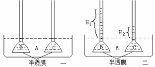 12.右图为渗透作用实验,开始如图(一),A代表清水,B、C代表蔗糖溶液,过一段时间后结果如图(二),漏斗管内液面不再发生变化,H1、H2表示漏斗管内液面与清水的高度差。下列说法错误的是 ( )