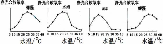 [解析]考查不同植物的光合作用强度的影响因素以及富营养化。颤藻属于蓝藻,是原核生物无叶绿体。其他几种植物是真核生物含有叶绿体。从图中可以读出不同植物进行光合作用的最适温度不同,栅藻为25℃、水绵为20℃、菹藻为15℃、颤藻为30℃。所以,一年中最早出现生长高峰的生物可能是菹藻,夏季高温长势最好的是颤藻。影响光合作用强度的因素有光照强度、CO2浓度、温度等,B组栅藻的浓度高,而其净光合作用放氧率低,最可能是栅藻密度过大导致其接受的光照强度弱所致,在富营养化的水体中,浮游藻类大量繁殖会消耗大量的氧气,另外藻类的大量死亡会导致微生物繁殖,也会消耗大量的氧气。
