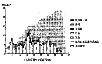 某沿海城市人口达1,600万,约60%居住在离市中心3千米的范围内。城市人口54%居住在贫民窟。下图示意该城市与大型商贸中心不同距离段的用地构成。据此完成6-7题。