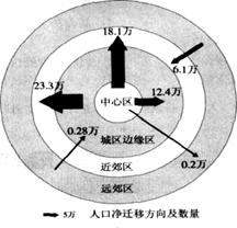 读“2005年我国东部沿海某市各圈层间人口净迁移模式图”(右图),完成8-9题。