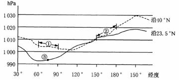 右图是某月份海平面平均气压沿两条纬线的变化图,读图回答 21-22 题。