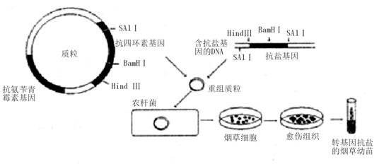 36.(9分)某质粒上有Sal I、Hind III、BamH I三种限制酶切割位点,同时还含有抗四环素基因和抗氨苄青霉素基因。利用此质粒获得转基因抗盐烟草的过程如下图所示,请回答下列问题: