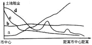 19、图中能正确表示城市从市中心到外缘地租水平变化趋势的曲线是: