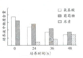 (1)由图可知,随培养时间延长,培养液中葡萄糖和氨基酸含量 ,尿素含量 。由于在原培养液中没有尿素,推测其是 的产物。