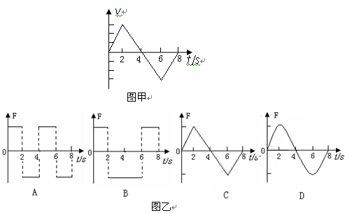 解析:由图甲可知前两秒物体做初速度为零的匀加速直线运动,所以前两秒受力恒定,2s-4s做正方向匀加速直线运动,所以受力为负,且恒定,4s-6s做负方向匀加速直线运动,所以受力为负,恒定,6s-8s做负方向匀减速直线运动,所以受力为正,恒定,综上分析B正确。