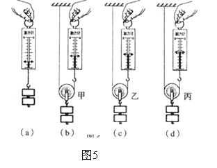 10、某小组同学研究动滑轮的使用特点,他们先用弹簧测力计缓慢提起钩码,如图5(a)所示,再分别用重力不同的动滑轮甲、乙、丙(G甲>G乙>G丙)缓慢提起相同钩码,如图5(b)、(c)、(d)所示。请仔细观察图是的操作和弹簧测力计的示数,然后归纳得出结论。