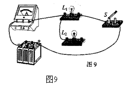 14、在图9电路中,有一根导线尚未连接,请用笔线代替导线补上,补上后使电键S能同时控制两盏灯。