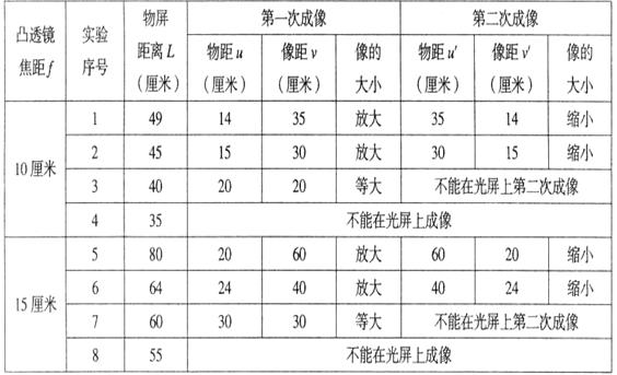 (3)继续分析比较表格是物屏距离L与凸透镜焦距f的数据及观察到的现象,可得出的结论:在____________________________________________________条件下,移动凸透镜,可以在光屏上得到一次放大的像和一次缩小的像。
