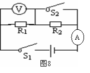 9、如图8所示,电压U恒定,当开关S1、S2闭合时,A 的读数为0.3A,当S2断开时,A的读数为0.1A,V的读数为6V,则电阻R1=__ _,R2=__ ___。