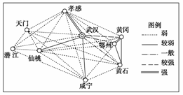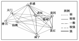 (6)图2可知:武汉与周围八个城市经济联系的空间特征主要表现为,从武汉-孝感一线开始,沿顺时针方向,城市联系等级呈 的趋势;武汉以外的八个城市经济联系的空间特征表现为,东部三城市之间的联系等级为“较弱”与 ,其他城市之间的联系等级为 。
