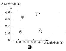 读图1“人口出生率和死亡率统计图”(甲、乙、丙、丁表示不同的国家),完成1-2题。