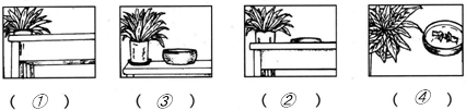 李老师家的餐桌上放着一盆花和一个鱼缸,机灵狗好奇地想看个究竟.请你按机灵狗四次观察的顺序:①站在地面上看;②抬起了前腿看;③站在凳子上看;④爬上了桌子看.在四个画面下的括号里分别标出相应的序号.