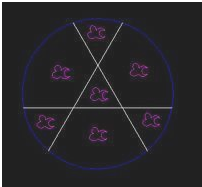 分析:为了美观,蛋糕上有七朵花,一般排列是中间一朵,周围六朵,周围六朵排列比较有规律,第一刀把这块蛋糕切成两块,一块三朵花,一块四朵花,同样第二刀也把这块蛋糕切成两块,一块三朵花,一块四朵花,这两刀要有一朵公共的花,这样两刀切完,原来三朵花那块都还有两朵,再一刀把这两朵切开,中间的一朵也被切开,这样就切成了七块,每块上都有一朵花.