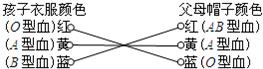 现有三个分别身穿红,黄,蓝上衣的孩子,他们的血型依次为O,A,B.每个孩子的父母都戴着同颜色的帽子,颜色也分红,黄,蓝三种,依次表示所具有的血型为AB,A,O.那么穿红、黄、蓝上衣的孩子的父母戴帽子的颜色是
