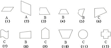 在平行四边形下面的括号里写A,梯形下面的括号里写B,其他图形下面的括号里写C.
