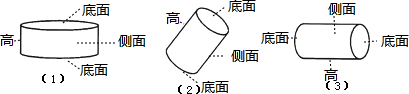 根据圆柱的特征,圆柱的上下面是完全相同的两个圆,侧面是一个曲面,侧面沿高展开是长方形;两个底面之间的距离叫做圆柱的高;由此解答.