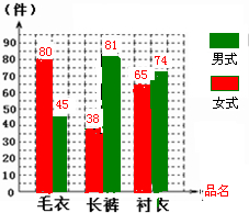 (2)根据统计表中的数据,纵轴代表件数,每格表示5件,横轴表示服装类型.即可绘制出复式条形统计图,要画出图例,用绿色代表男式,红色代表女式.