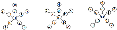 解答:解:把1~11填入图中,使每条线上三个数的和相等,有三种填法,如下图所示: