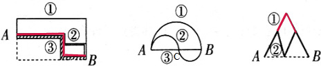 分析:如下图:(1)通过平移,得出②和③的长度相同,但①的长度比②和③多出左边竖着的一段的长度;