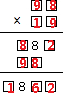 .分析:因为积的百位上是8,所以两次乘得的积的最高位上,都是9,或者其中一个是8,所以上面因数的最高位上都是9,下面因数的个位上也是9,又因为第一次乘得的积的十位上是8,所以上面因数的个位上是8,98×9=882,符合题意;又因为第二次乘得的积是两位数,则下面因数的十位上是1,则98×19=1862.