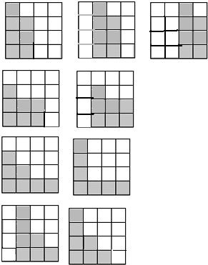 种涂色的图案.分析:按照要求把4x4方格的7个格子进行涂色,左侧的涂色的方格数大于或等于右侧涂色的方格数,把7分成几个数的和,左边的数最大是4,例如4+3=7,涂在第一列开始到第三列开始有3种图案;